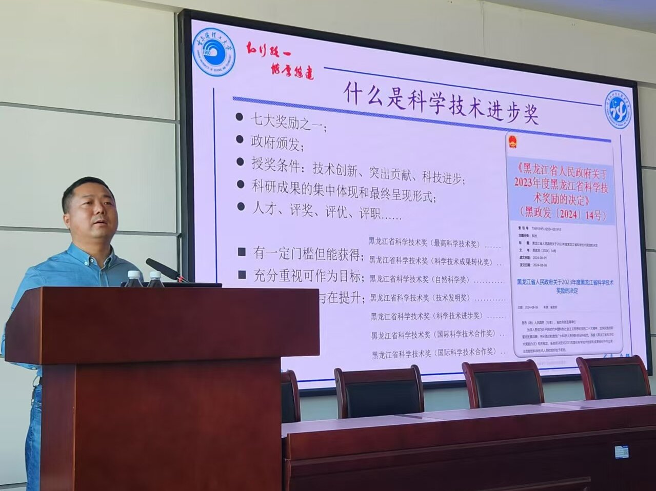 会上,韩继超、冯宇和黄海三位教授分别总结了自身在报奖过程中的体会和经验,就报奖的准备与流程、提名书和系统填报注意事项、个人感悟等方面与参会人员进行了分享和交流。三位教授均是在我省科技奖申报政策调整变化后首轮授奖,且各高校、科研院所、企业等都积蓄了大量优秀成果的激烈竞争形势下脱颖而出,成功斩获一等和二等奖佳绩的青年才俊。他们的交流分享可操作性强,既具有战略性思想,也有具体的战术性指导。这不仅使与会科研人员报奖的思路更加清晰,更激发了我校教师,尤其是青年教师在黑龙江省科技奖项上的角逐热情与信心。
