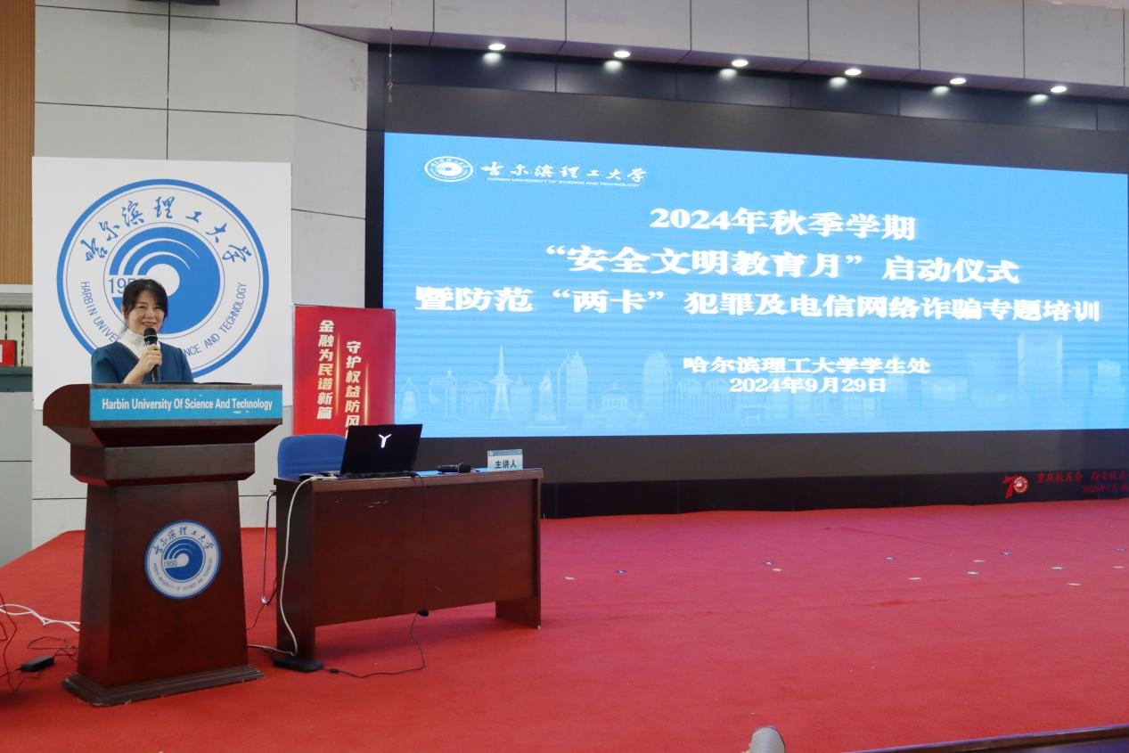 为深入贯彻落实省委、省政府和省教育厅关于《黑龙江省2024年安全工作有关要求》和《哈尔滨理工大学2024年学生安全教育工作要点》,进一步增强学生法制观念和金融安全意识,提高学生电信网络诈骗识骗防骗能力。9月29日上午,由党委学生工作部主办,“一站式”学生社区-党员e家育人工作室承办的2024年秋季学期“安全文明教育月”启动仪式暨防范“两卡”犯罪及电信网络诈骗专题培训在西区一号楼0220报告厅成功举办。龙江银行哈尔滨分行、哈尔滨市公安局南岗分局相关同志,党委学生工作部班子成员、各学院学生工作负责人及辅导员,各学院安全稳定信息员代表以及学生处工作人员参加本次培训。培训由党委学生工作部副部长田海燕主持。