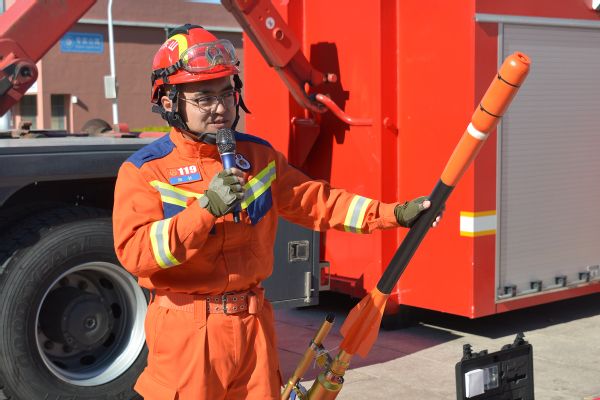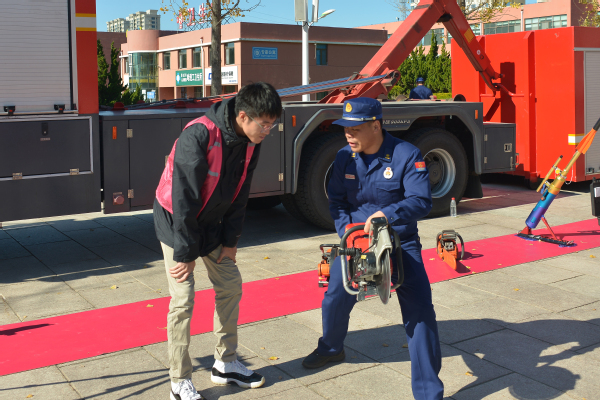 紧接着,消防装备展示区则展示了各种先进的消防器材和救援设备。从消防车、各式救生钳锯、到生命探测仪、生化防护服等,每一件装备都引起了师生们的浓厚兴趣。消防员们耐心讲解装备的功能和使用方法,让师生们对消防工作有了更加直观的认识。