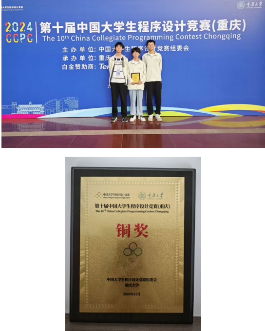 11月10日,第十届中国大学生程序设计竞赛(CCPC)重庆站举行。本次比赛由重庆大学承办,吸引了来自中山大学、北京大学、杭州电子科技大学、北京航空航天大学、哈尔滨工业大学等全国190所高校的278支队伍参加比赛。“Day-100”代表队荣获铜奖。这是学院首次在这项高水平竞赛中获得国家级别奖项,实现了历史性的突破。