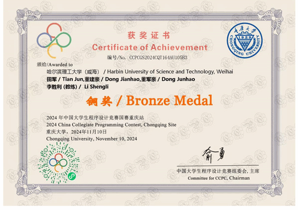 10月20日,第十届中国大学生程序设计竞赛(CCPC)哈尔滨站举行。本次比赛由东北林业大学承办,吸引了来自北京大学、中国科学技术大学、清华大学、上海交通大学等全国178所高校的279支队伍参加比赛。由软件工程系22级学生董建豪、董军豪和软件23级学生田军组成的“Day-100”代表队荣获优胜奖。