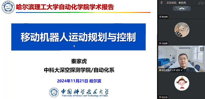 为拓宽我院师生科研视野、促进院校间学术交流,应自动化学院邀请,2024年11月21日,中国科学技术大学博士生导师秦家虎教授作了题为“移动机器人运动规划与控制”的学术报告。报告会由自动化学院院长胡军教授主持,学科方向带头人、骨干教师、相关学院教师及硕博研究生等90余人在线参会。