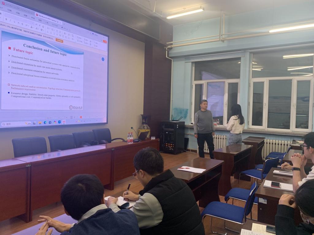 报告会上,孙书利教授主要介绍了多传感器系统分布式信息融合估计方法的一些最新研究成果。首先,介绍了不同融合机制的原理及优缺点;其次,在线性无偏最小方差准则下,结合先验融合估计,提出了一种通用的分布式递推线性融合估计算法;接着,将其应用于线性离散系统和随机参数化系统,分别提出了带反馈和不带反馈的分布式递推融合估计器,并给出算法稳定性及稳态特性的分析。最后,针对带反馈的分布式递推融合估计给出全局最优性分析。