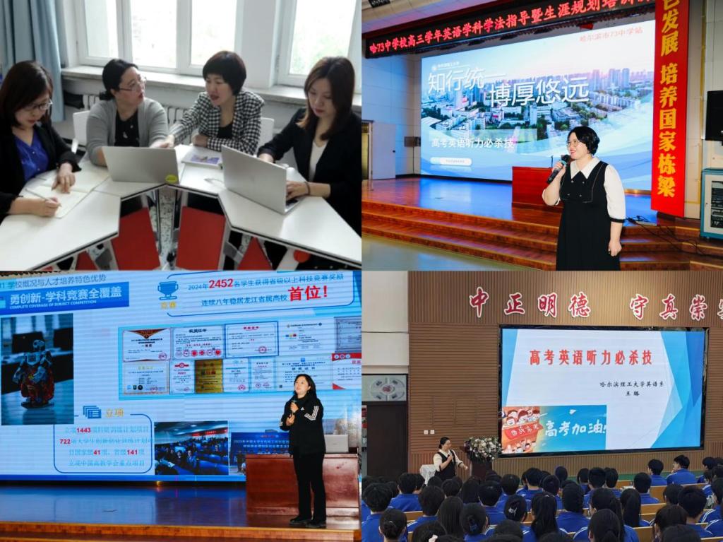 外国语学院针对“新高考”英语考试变化,学院领导组织骨干教师依托省级一流课程《英语听力》开发高中英语听力技巧指导讲座,纳入学校“高校-高中”协同育人项目库。先后应邀为哈尔滨中实中学高三年级、哈尔滨市七十三中学高三年级和新疆班同学作指导讲座,讲座内容得到高中师生高度评价,在助力高中英语教学的同时有效提升学校招生宣传工作。