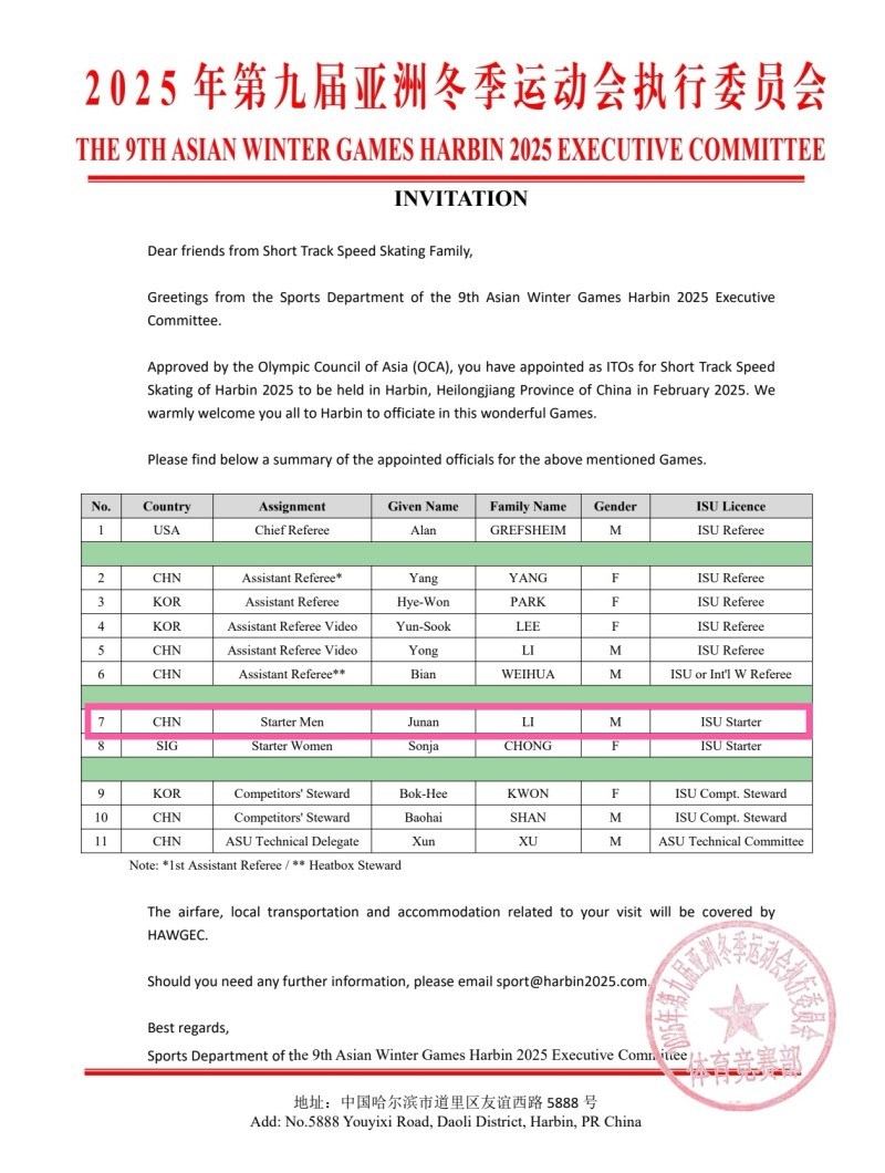 在激烈的国际选拔中,李居南老师凭借扎实的短道速滑规则知识、出色的双语执裁能力以及沉稳冷静的专业素养,成功通过ISU的严格考核,晋升为ITO一段,成为国内优秀的国际裁判之一。他的入选,展现了个人能力,也体现出中国冰雪裁判在国际舞台上的影响力逐步提升。