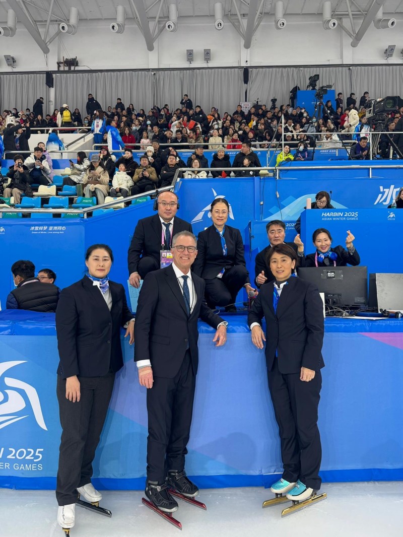 在亚冬会短道速滑男子组赛事里,李居南老师的每一声指令都精准无误,以毫秒级的精度把控比赛开始的关键时刻,确保了赛事的公平公正进行,向世界展示了中国冰雪裁判的专业水平。