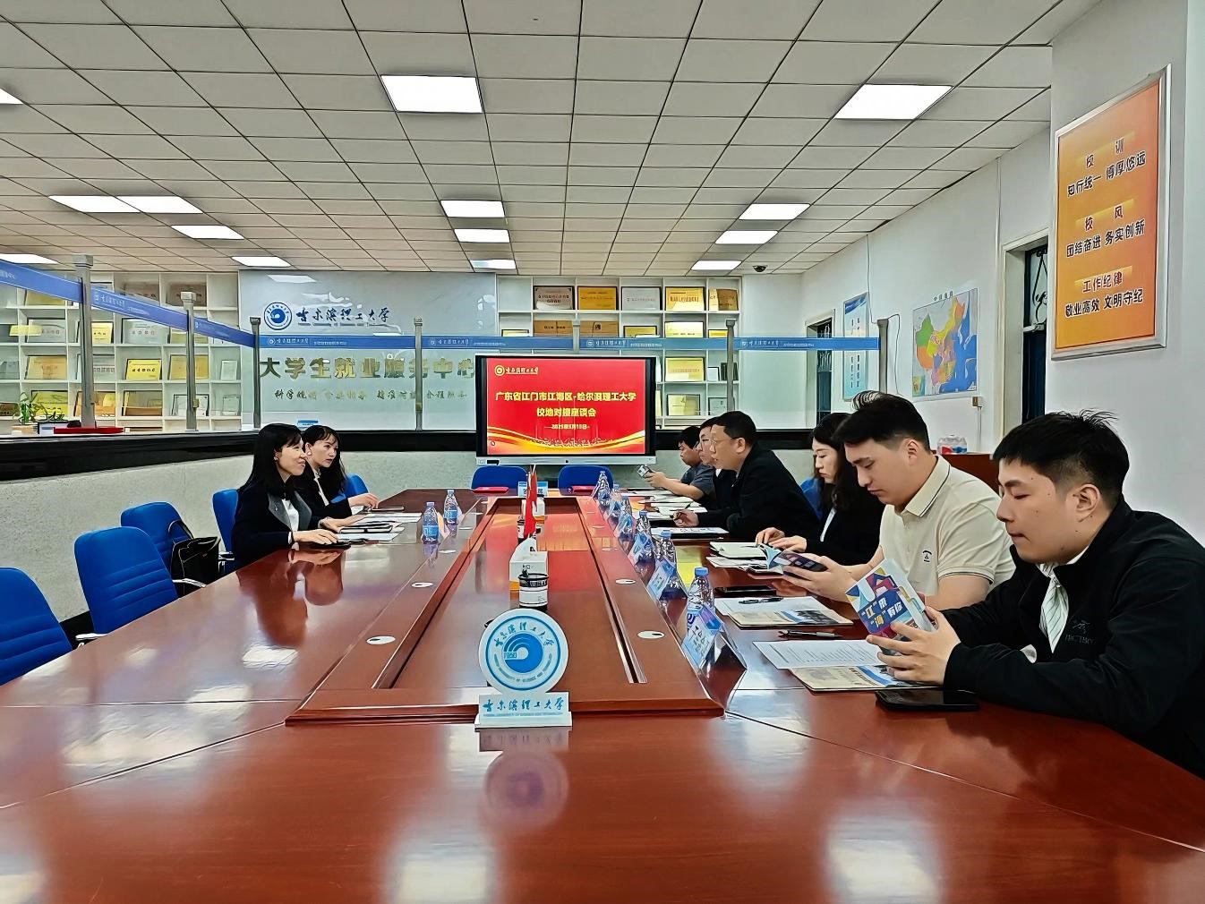 李碧华对学校的热情接待表示感谢,详细介绍了江海区人文环境和就业政策,重点提出在毕业生就业对接、博士后工作站共建、校企联合课题研究等领域的合作愿景。