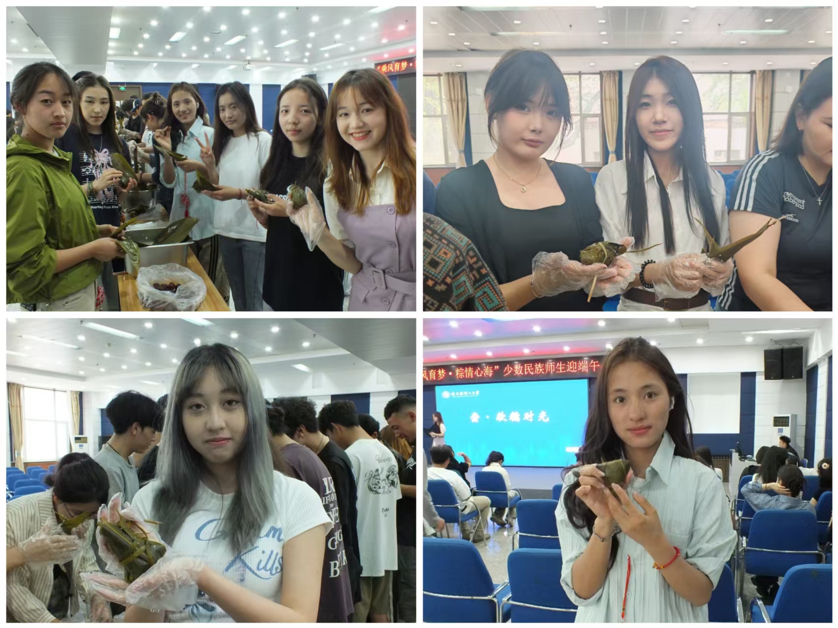 来自藏族、维吾尔族、哈萨克族、回族、布依族、汉族等各民族师生欢聚一堂,学习端午节文化,感受中华优秀传统文化的魅力,加深对中华优秀传统文化的认同。学生代表电信24-5班王湛越、信息23-4班阿尔孜古丽·吐尼牙孜、工设22-2伊木然·阿卜杜热西提为师生们带来精彩的乐器和歌舞表演。金融22-1班的迪丽菲热·外力以喀什青年的名义和在座的师生分享喀什的端午节习俗,讲述着“各美其美,美美与共”的中国故事。