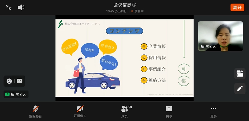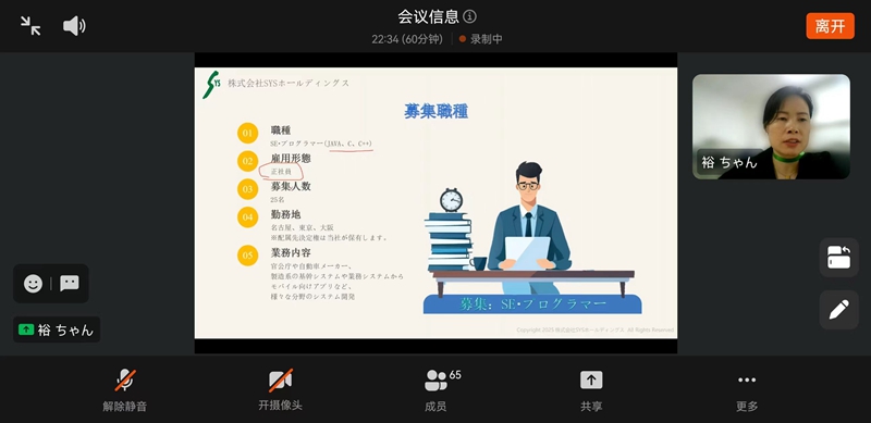6月11日,外国语学院于线上举办西安裕日软件有限公司专场招聘宣讲会。企业宣讲人岳喜迎,学院党委副书记张宏亮、2026届毕业生辅导员贾昊鹏、2025届毕业生辅导员白雨卉、2026届日语专业学生及2025届部分未就业学生参加了本次宣讲活动。活动由贾昊鹏主持。
