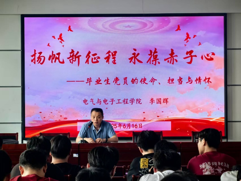 学院党委副书记李国辉以“扬帆新征程,永葆赤子心——毕业生党员的使命、担当与情怀”为主题,为毕业生党员讲述了最后一堂意义深远的党课。党课上,李国辉书记结合当下社会发展形势与国家需求,深入阐述了毕业生党员在新时代所肩负的使命与担当。他强调,毕业生党员无论走向何方,身处何种岗位,都要时刻牢记自己的党员身份,以赤子之心坚守初心使命,以实际行动践行党的宗旨。在工作中要勇于担当,积极发挥党员的先锋模范作用,为社会发展贡献自己的力量。同时,他鼓励毕业生党员保持学习热情,不断提升自身能力,在新征程中展现理工电气学子的风采。