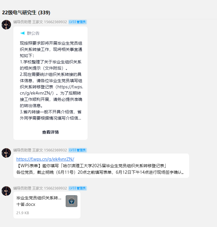 为帮助毕业生党员清晰了解组织关系转接流程,解决可能面临的问题,毕业班辅导员通过线上党员群积极转发《毕业生党员提示卡 —— 组织关系转接十问十答》。提示卡内容涵盖了毕业生党员在组织关系转接中常见的问题,如“已落实工作单位,党组织关系应转到哪儿”“工作单位未建立党组织,如何转接组织关系”“未落实工作单位,党组织关系如何处理”等十个关键问题,并给出了详细且明确的解答。通过这一举措,确保每位毕业生党员都能准确知晓组织关系转接的相关事宜,避免因流程不明导致的转接不畅,为毕业生党员顺利开启新征程提供了基础保障。