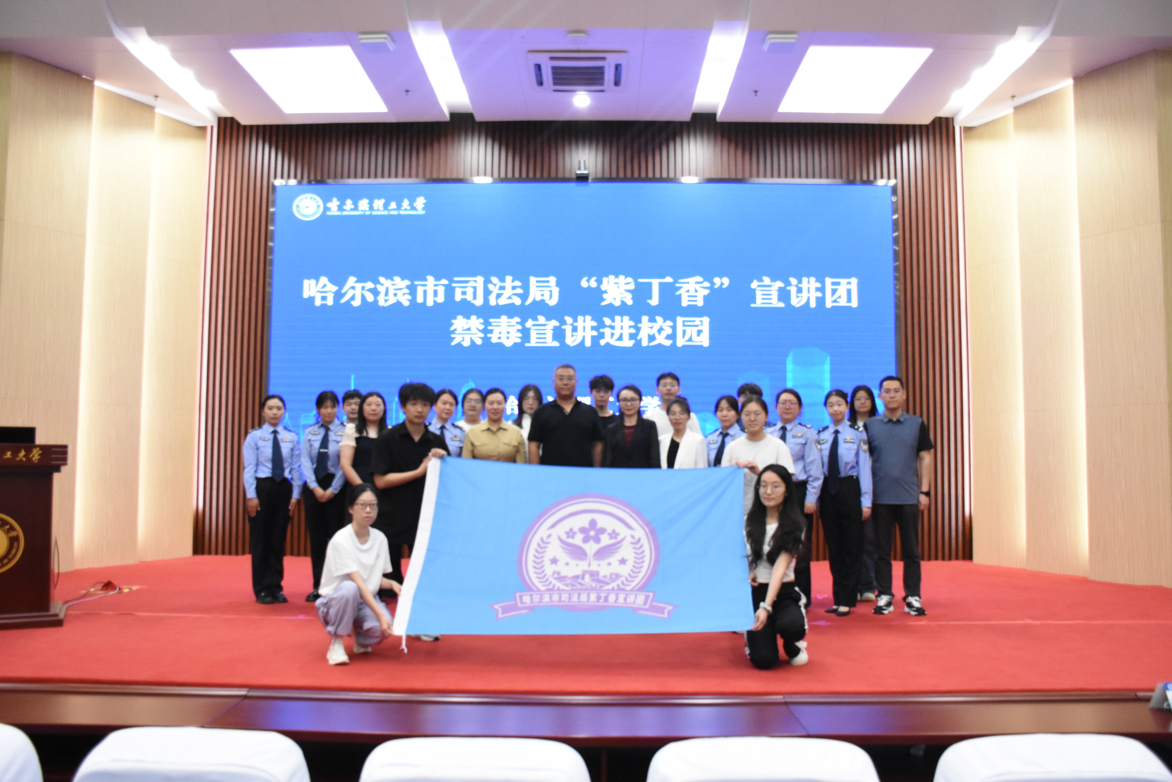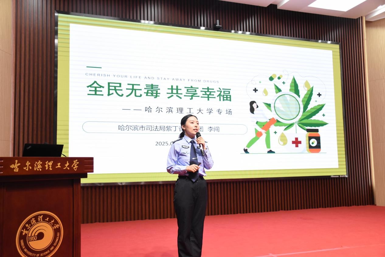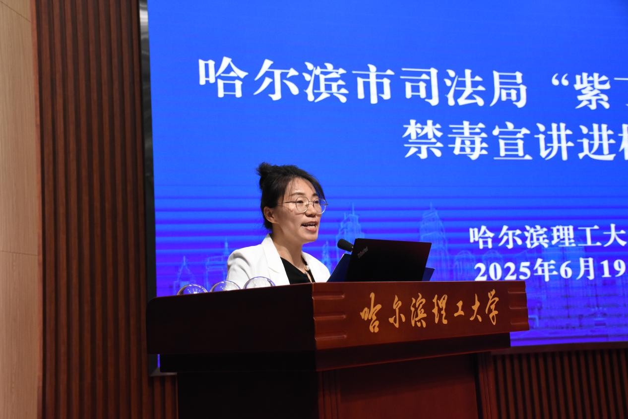 在第37个“6·26”国际禁毒日来临之际,为深入学习贯彻习近平新时代中国特色社会主义思想,坚决落实《全民禁毒宣传教育工作实施意见》,推动“大思政课”理念落地生根,厚植青年学生法治意识与使命担当,6月19日下午,哈尔滨市司法局“紫丁香”宣讲团走进哈尔滨理工大学,在教学主楼五楼报告厅开展以“全民无毒·共享幸福”为主题的禁毒宣讲活动,奏响青春与法治共鸣的铿锵之声。