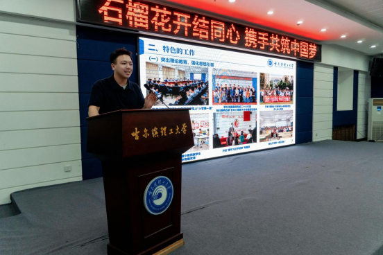会上,学校“石榴籽”工作室负责人刘元昊老师详细地介绍了工作室的基本情况、特色工作和取得的成效。他表示,学校将会立足于同学们的成长成才需求,持续推进“四助工程”建设,不断创新工作室“互助融合”的培养模式,用心用爱用情做好各民族学生的教育管理和服务工作。