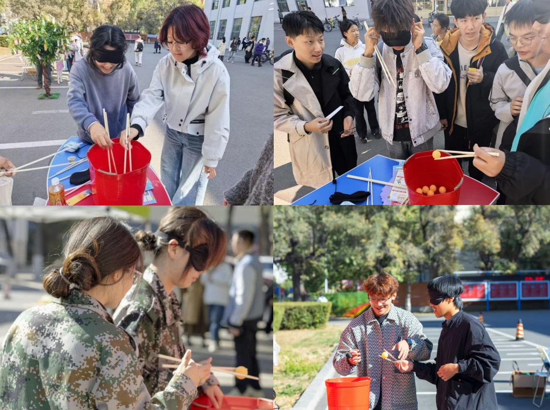 联结协作区的“筷”乐传送游戏更是将现场气氛推向高潮。同学们两人一组,一人蒙住双眼,在未知中探索,另一人则担任“指挥塔”,用清晰、准确的语言引导同伴用筷子夹起圆滑的乒乓球,并协同将其安全送达终点。过程中不仅考验了同学们的协作能力,更在欢声笑语中增进了彼此的情感连接。