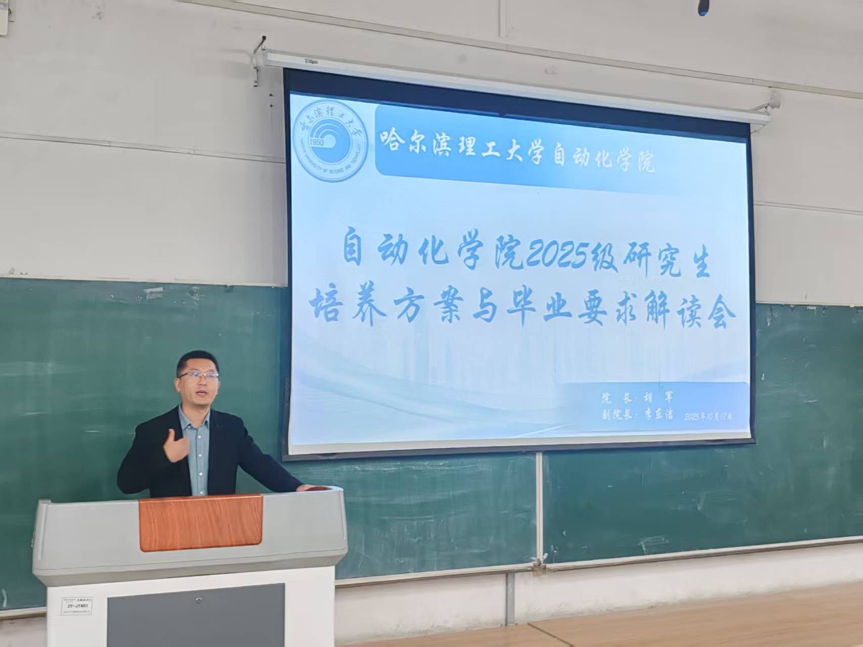 为帮助2025级研究生深入了解专业培养目标,科学规划学业生涯,尽快适应研究生阶段的学习与科研生活,自动化学院于2025年10月17日在新主楼A514举行了“2025级研究生培养方案与毕业要求解读会”。院长胡军、副院长李东洁、副书记刘桂娟、研究生辅导员臧若家及2025级全体研究生参加了此次会议。会议由臧若家主持。