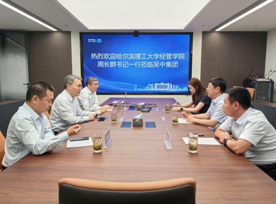 吴中集团总裁助理赖华聪对吴中集团进行详细介绍,他指出,吴中集团现已成为以现代服务业为主导的大型综合性企业集团,形成“3+2”产业布局——以城市开发与运营、金融服务、汽车销售为三大重点产业,教育和康养为两大战略性新兴产业。周长群介绍了学院的发展历程、师资力量、科学研究等情况,表示期待与吴中集团在横向课题项目申请、促进大学生就业以及党建等工作方面进一步合作,并就建立常态化的实习生和毕业生输送机制达成了共识,郭宝鹏介绍了学院毕业生就业、校企合作、社会服务等情况。