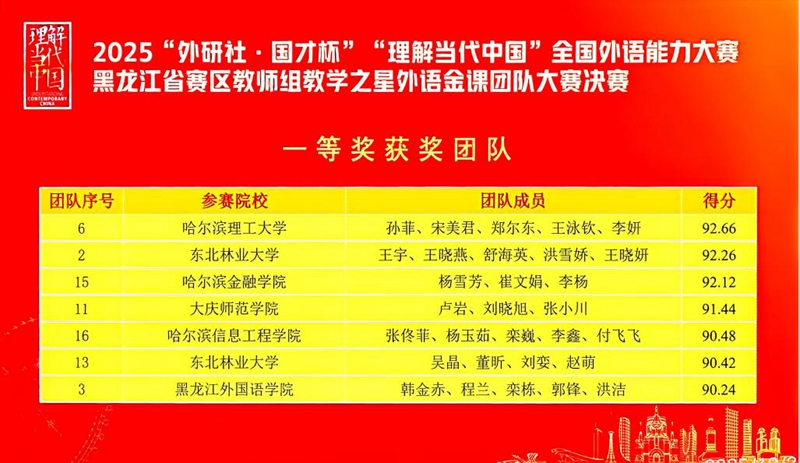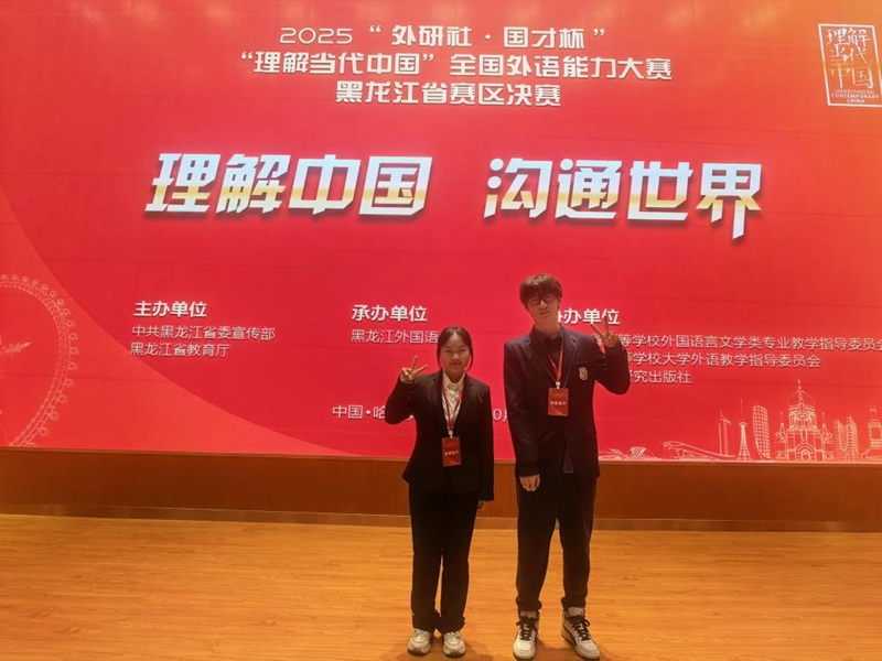 近日,2025“外研社·国才杯”“理解当代中国”全国外语能力大赛黑龙江省赛区获奖名单公布,我校师生在各项赛事中表现亮眼,学生组共荣获金奖7项、银奖6项、铜奖9项,其中金奖选手将代表黑龙江省赛区出征本年度全国总决赛;在教师组比赛中,外国语学院大学外语教学部孙菲、宋美君团队凭借《大学英语》课程的精彩展示,夺得黑龙江省赛区决赛一等奖,英语系魏智男、田凌云团队获得省赛三等奖。