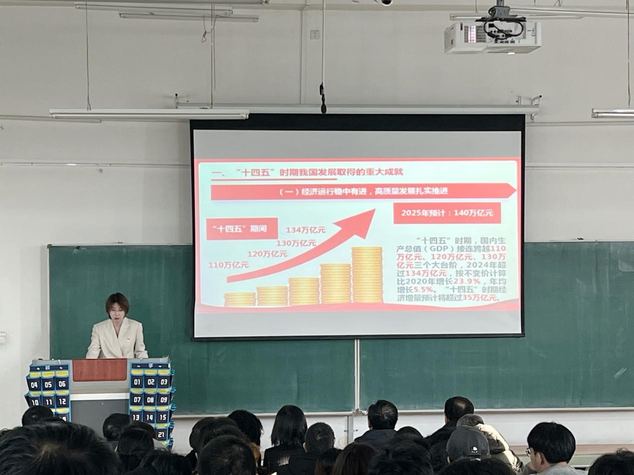 胡紫薇以《学习贯彻党的二十届四中全会精神 勇担为党育人、为国育才使命》为题,系统阐述了党的二十届四中全会的重大意义,全面回顾了“十四五”以来我国发展取得的历史性成就,深入解读了“十五五”时期的指导思想、基本原则与主要目标。她指出,当前正处于“十四五”收官筑基、“十五五”谋篇布局的关键阶段,师生党员应胸怀“国之大者”,精准把握机遇与挑战,进一步理清发展思路、锚定奋斗目标,坚持目标导向与系统推进,为基本实现社会主义现代化贡献智慧与力量。整场报告立足国家战略全局,紧密贴合高等教育实际,为全院师生党员深刻领会全会精神、科学谋划学院发展提供了重要指导与实践指引。