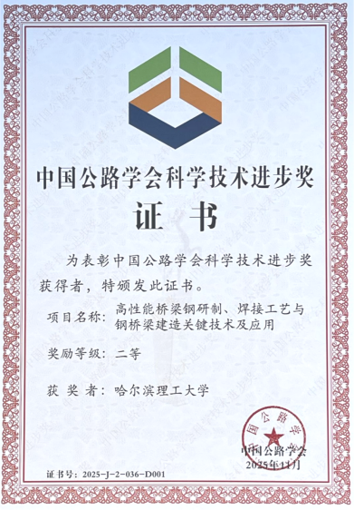 近日,中国公路学会公布了“2025年度中国公路学会科学技术奖”获奖结果并举行颁奖大会。我院王圣保教授完成的科研成果《高性能桥梁钢研制、焊接工艺与钢桥梁建造关键技术及应用》获得我国公路交通行业权威学会中国公路学会科技进步二等奖,这是我院第一次获国家一级学会科技奖励,彰显了我院科研团队在跨学科、跨领域协同创新与解决重大工程关键技术难题的能力。中国公路学会科学技术奖是我国公路交通领域权威行业科技奖,由国家科学技术奖励办公室批准设立,具有国家科技奖推荐资格。