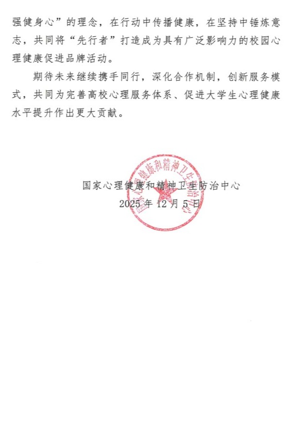 近日,我校收到国家心理健康和精神卫生防治中心发来的感谢信,信中对我校在第四届“先行者心理健康校园行”活动中的卓越表现给予高度赞誉,这是国家主管部门对我校心理健康教育工作的充分肯定,更是全体师生共同努力的丰硕成果!