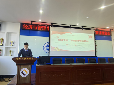 为深入学习贯彻党的二十届四中全会精神,引导学院师生深刻领会、准确把握全会核心要义与实践要求,切实把思想和行动统一到中央决策部署上来,12月26日,经济与管理学院在学院学术报告厅举办学习贯彻党的二十届四中全会精神专题宣讲报告会。会议邀请马克思主义学院教师关靖华作专题辅导报告。学院领导班子成员、各党支部书记、师生党员及学生代表齐聚一堂,共同参加了此次学习。报告会由学院党委书记周长群主持。