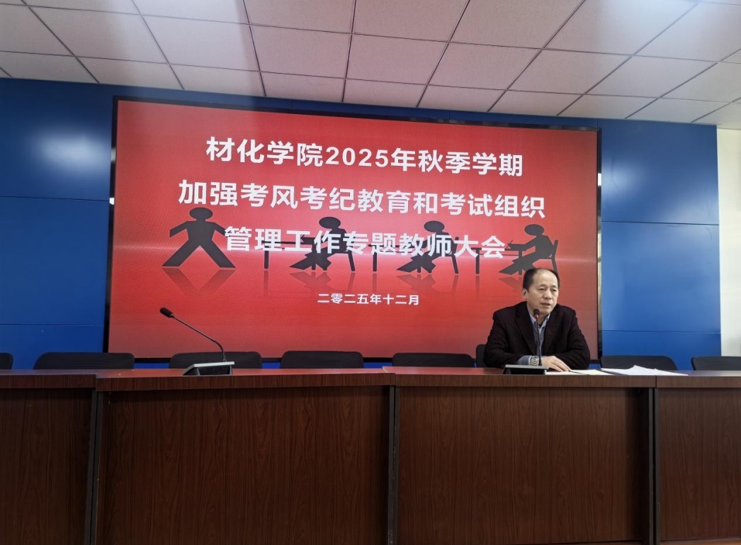考风考纪是保障考试公平公正的生命线,更是衡量学院教风学风的重要标尺。为进一步加强考风考纪建设,规范考试组织管理流程,切实强化全体教师的责任意识与纪律意识,12月26日下午,材化学院在化工楼430会议室召开2025年秋季学期加强考风考纪教育和考试组织管理工作专题教师大会。学院全体教职工、院领导班子成员参会,会议由副院长康福伟主持。康福伟强调了加强考风考纪建设的重要性和必要性,结合学校和学院相关制度文件,从授课教师出题、阅卷、监考、提交课程资料等方面提出了严格要求。