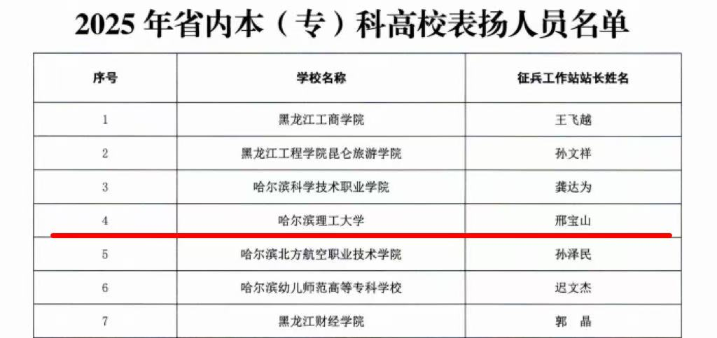 近日,黑龙江省人民政府征兵办公室、黑龙江省教育厅联合开展的2025年度省内本科高校征兵工作量化考评结果正式公布。我校凭借扎实高效的征兵工作举措、特色鲜明的创新实践与优异的综合工作成效,在全省众多参评高校中脱颖而出,荣获2025年省内本科高校征兵工作量化考评第7名(69所高校),省内本(专)科高校表扬人员1名,充分彰显了学校在国防教育与征兵工作中的扎实基础与突出实力。