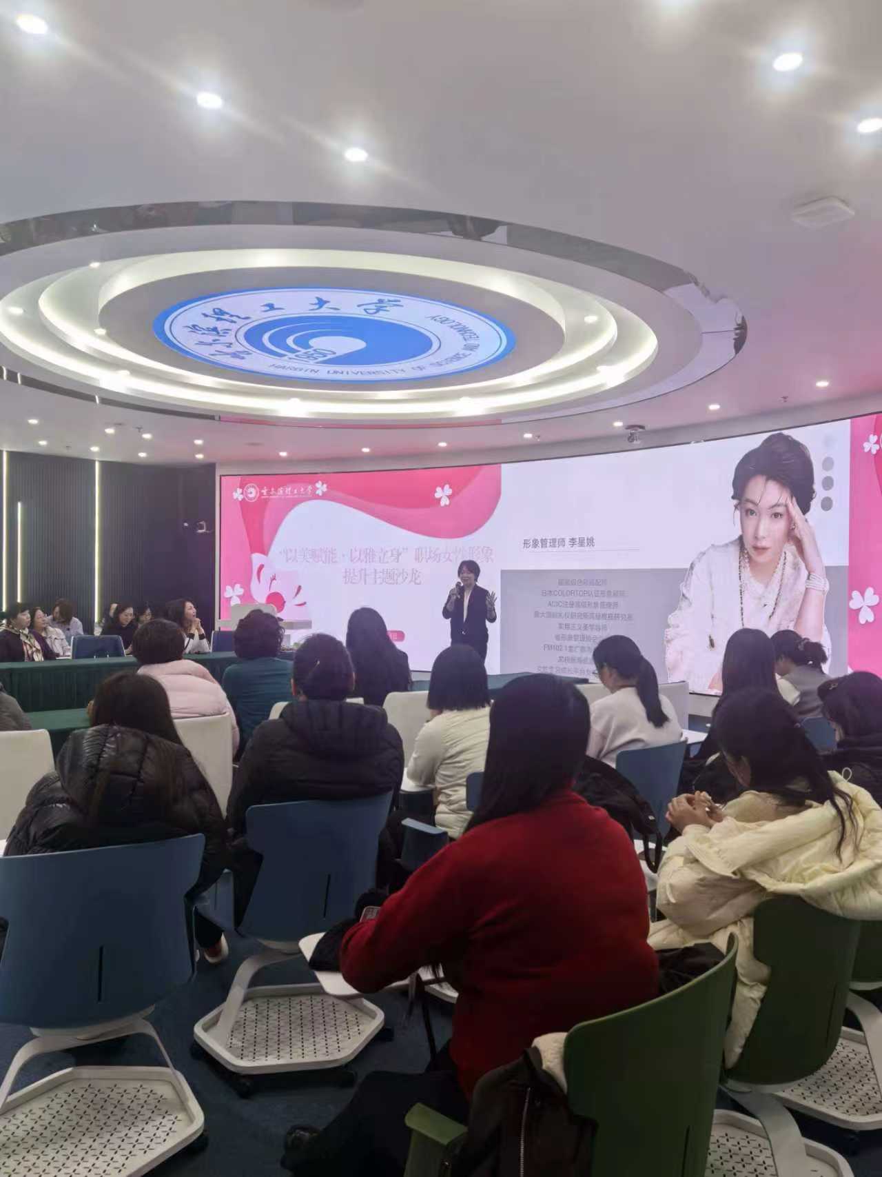 为庆祝第116个“三八”国际劳动妇女节,进一步提升我校女教职工的职业形象与审美素养,3月6日下午,“以美赋能·以雅立身”职场女性形象提升主题沙龙在智慧校园一体化教室成功举办。本次活动特邀从业14年的国家级色彩搭配师、资深时尚专家李星姚担任主讲,各基层工会选派的40余名女教职工代表齐聚一堂,共赴一场美学与成长的专属之约。