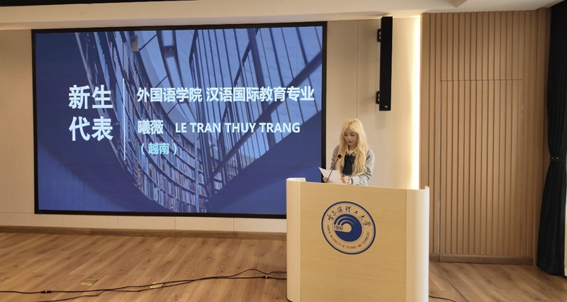 随后,新生代表依次发言。来自俄罗斯的丁小月分享了初到校园的感受,感谢师生温暖陪伴的同时更表达了自己能够快速适应环境的喜悦;来自越南的曦薇同学则表达了对未来学习生活的期许,希望与各位同学共同成长,虽然大家目标不同但是都要成为“更好的自己”。在校生代表安娜以“学姐”的身份,结合自身学习经历为新生们分享了汉语学习的实用建议,鼓励大家克服语言难关,勇敢表达、积极探索。