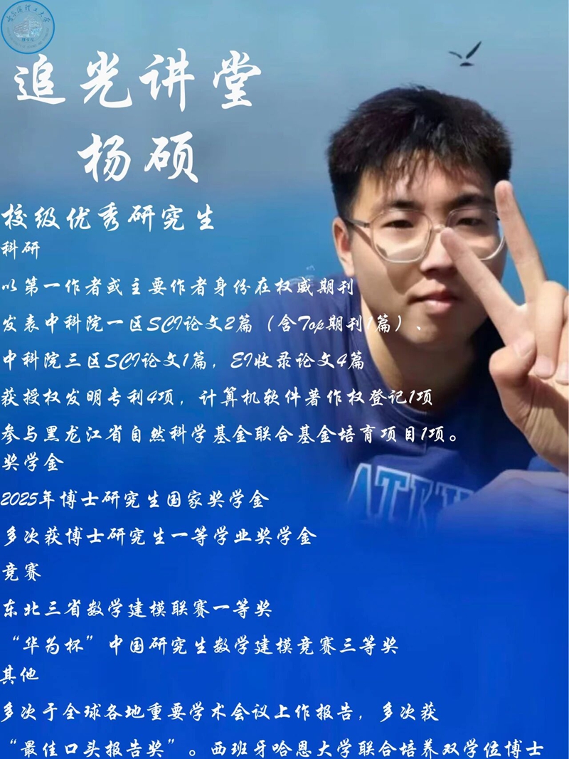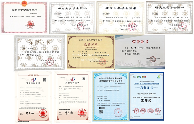 杨硕,理学院数学专业2022级博士研究生,共青团员。曾获博士研究生国家奖学金、校博士研究生一等学业奖学金3次;校“校优秀研究生”、校“优秀共青团员”;2022年东北三省数学建模联赛一等奖、“华为杯”第二十届中国研究生数学建模竞赛三等奖;2025年国际联合指导博士论文流动资金资助项目(西班牙哈恩大学)、第一届先进控制与人工智能国际会议优秀奖(Award for Excellence)、第七届信息科学、电气与自动化工程国际学术会议(ISEAE 2025)最佳口头报告奖(Best Oral Presentation);已发表学术论文7篇,其中SCI检索3篇(中科院1区期刊2篇、IEEE汇刊1篇),EI检索4篇;已授权发明专利4项,登记计算机软件著作权1项。