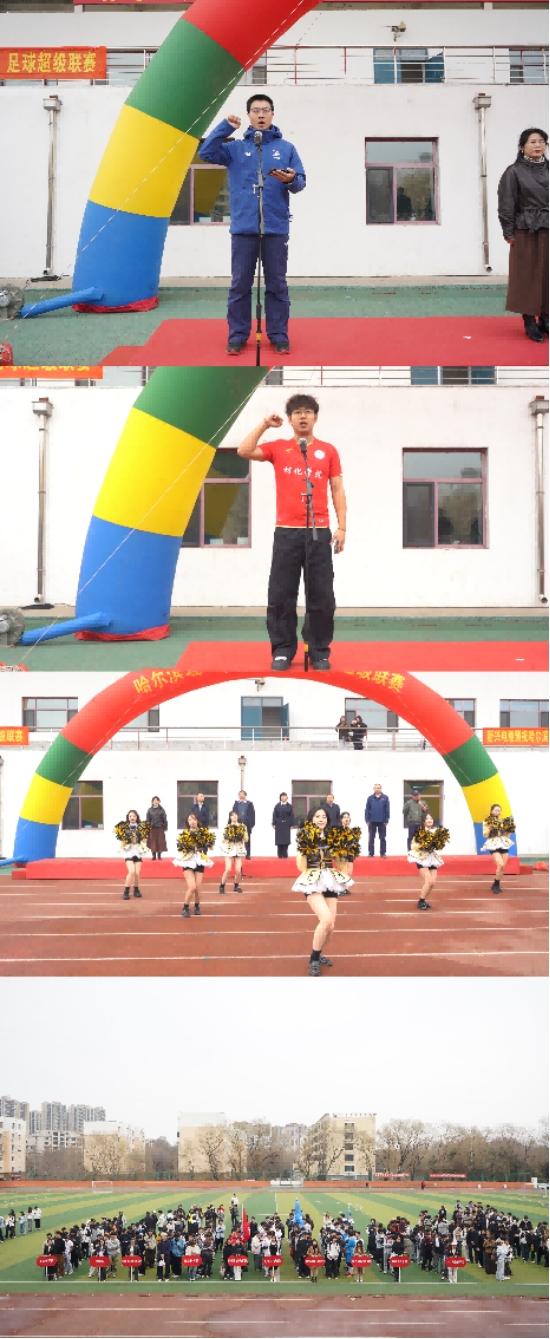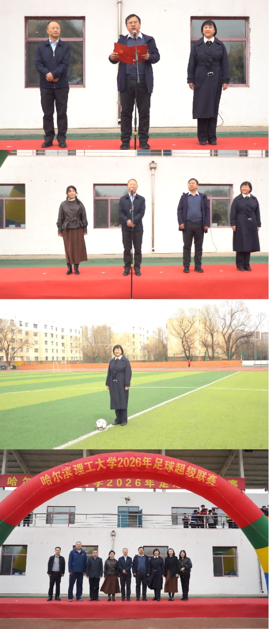 为全面贯彻党的教育方针,全面落实立德树人根本任务,树立“健康第一”理念,深入推进《哈尔滨理工大学学生体质提升专项行动实施方案》的执行,4月16日,哈尔滨理工大学2026年足球超级联赛在南区体育场开幕。党委学生工作部部长戴湘竹、校团委书记韩彧博、电气学院党委书记刘骥、体育教学部主任董少伟、党委学生工作部副部长田海燕、校团委副书记段云菲、电气学院党委副书记李国辉、体育教学部副主任孙树滨、体育教学部主任助理白铂以及来自全校各学院、体育教学部的领导、老师出席了开幕式。运动员、教练员、裁判员和观众近400人齐聚一堂,共同见证这场充满青春活力与拼搏精神的校园体育盛会。