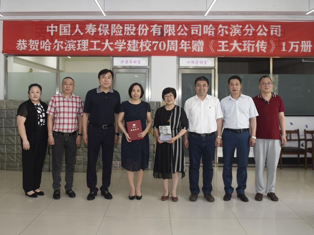 值此我校建校70周年之际,7月2日下午14:00,中国人寿保险股份有限公司哈尔滨分公司赠哈尔滨理工大学《共和国科学拓荒者系列——王大珩传》仪式,在西区七公寓心理健康教研室大厅举行。中国人寿哈尔滨分公司副总经理邵辉、健康险部经理赵琰、平房区支公司经理张良、健康险部副经理邬喜翔,校党委副书记陆岩、学生工作部(处)长杨忠学参加了赠书仪式。