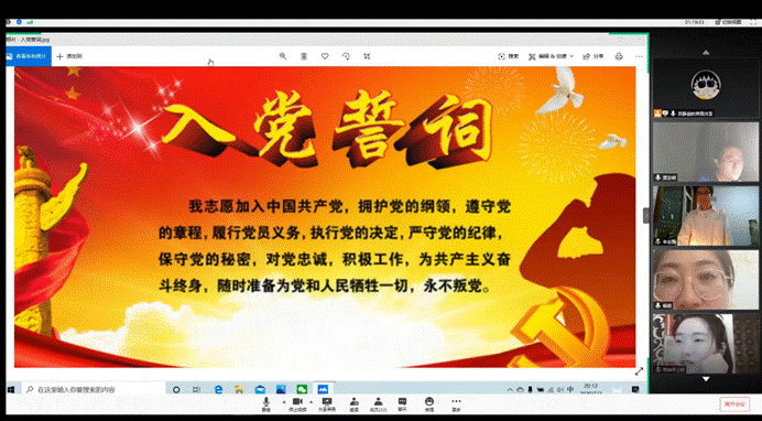 在支部副书记吴静谊的领誓下,全体参会党员在镜头前起立,举起右拳进行宣誓,“我志愿加入中国共产党,拥护党的纲领、遵守党的章程、履行党员义务、执行党的决定、严守党的纪律、保守党的秘密,对党忠诚、积极工作,为共产主义奋斗终身,随时准备为党和人民牺牲一切,永不叛党。”一声声掷地有声的承诺也预示着测通学院学生第五党支部全体党员的决心。