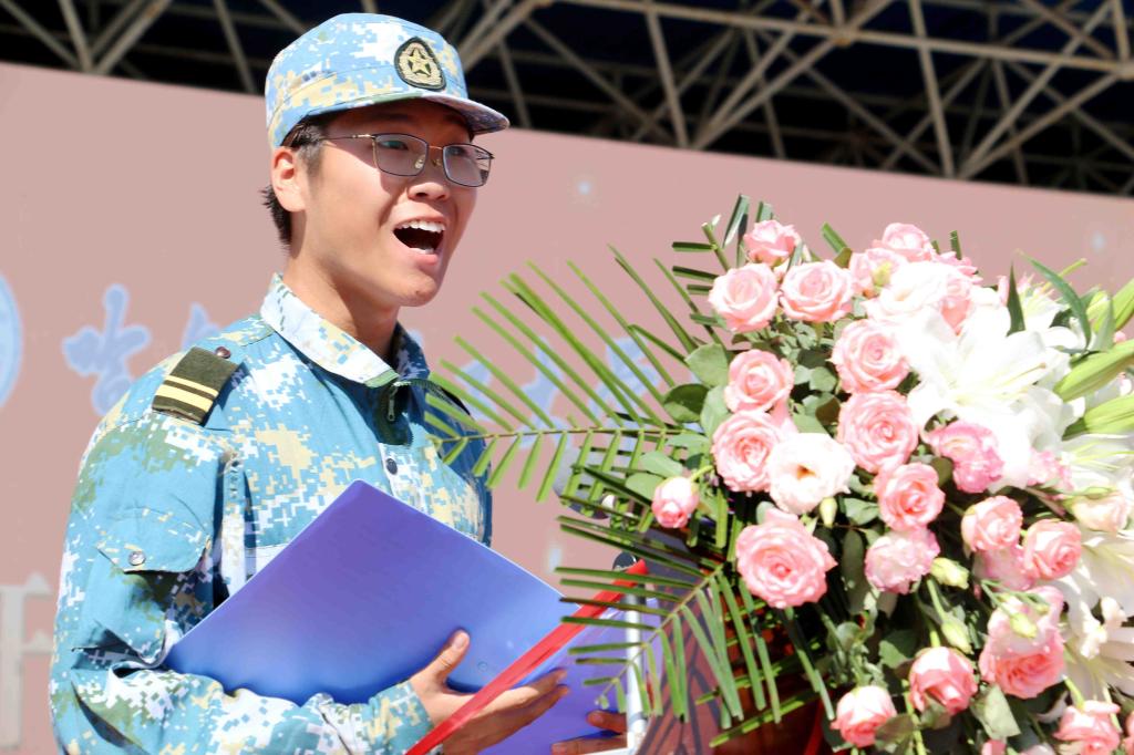 校党委常委、工会主席兼荣成学院院长徐向晨在典礼上代表学校发表讲话。他首先向认真负责、严格训练的全体参训教官表示衷心的感谢,向怀着探索真知的远大志向考入哈尔滨理工大学并圆满完成军训任务的2019级新生表示热烈的欢迎和衷心的祝贺!徐院长说,作为青年人,我们必须要不断奋斗,只有把自己的命运同祖国的命运维系在一起,我们的人生才能放射出最美的光华,才能演奏出华美的乐章。2019年是一个饱含纪念意义和追求荣光的年份。新同学们,你们注定是不平凡的,你们青春勃发、激情四溢,承续着五四先驱们的精神,传递着民族独立的尊严和豪情,沐浴着新时代的安定与繁荣,聆听着哈理工70年奋斗不息的弦歌,相信你们会在下一个70年书写出更为动人的理工故事,谱就更加精彩的人生华章。徐院长强调,大学这座象牙塔并不是避风的港湾,它理应成为同学们乘风破浪的加油站,十年寒窗诚然刻苦,大学时光更须拼搏。他希望同学们在四年的大学生活中能做到以下三点:第一,不忘初心,牢记使命;第二,不忘勤学之本,苦练内功;第三,铸就精彩人生,追求自我,成就自我。(摄影:宋伶俐 新媒体中心)