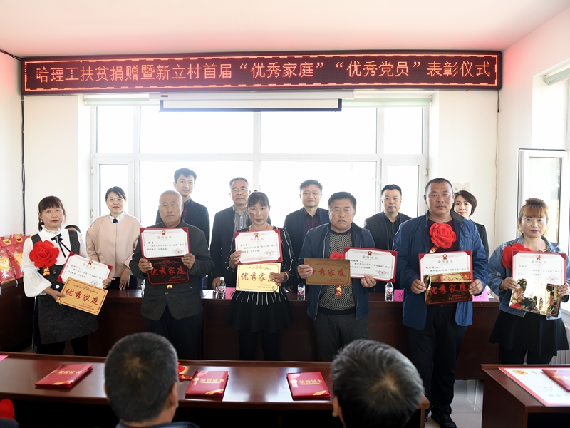 9月25日上午,哈理工产业扶贫电商项目捐赠仪式及新立村2019年度“优秀家庭”、“优秀党员”表彰系列活动在巴彦县丰乐乡新立村举行。校党委书记张洪涛、党委副书记王志浩,巴彦县党委组织部副部长许汉波,丰乐乡党委副书记贾彦莉、副乡长古力,我校统战部部长孙明哲、组织部副部长王莉娟、扶贫工作队队长兼驻村第一书记董少伟及扶贫工作队成员刘猛和张宏磊出席活动,新立村2019年度“优秀家庭”和“优秀党员”代表参加活动。活动由董少伟主持。