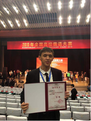10月26-28日在北京外国语大学外研社国际会议中心举行的第十一届全国高校俄语大赛中,我校俄语专业18级刘善得同学最终在低年级组综合赛中取得全国第二名的好成绩,获得国家留学基金委全额资助赴俄罗斯留学名额。俄语19级研究生孟立伟获才艺类单项赛第二名。