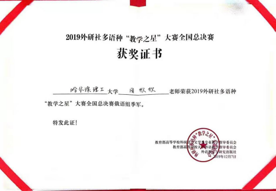2019年外研社多语种“教学之星”大赛自启动以来,共有来自全国200所院校300余名教师成功进入全国复赛,全国复赛以“录制真实课堂视频”的形式进行评选。组委会经过双向匿名评审,最终选拔出7个语种9个组别共112名参赛教师晋级全国总决赛。其中日语专业组共18名选手、俄语专业组共12名选手晋级总决赛。全国总决赛的冠亚季军争战强势拉开,北京外国语大学、广东外语外贸大学、四川外国语大学、天津外国语大学、大连外国语大学等外语强校都派出了强大的选手阵容参赛。刘丽丽老师和田欣欣老师在学院领导精心指导下,将外语国标精神和课程思政巧妙地融合在课程设计之中,反复推敲教案,精心设计课件,实战演练课堂讲授环节,克服种种困难,凭借扎实的功底,匠心的精神斩获了日语组和俄语组的季军,这是我校外语专业在全国大赛中获得的最好成绩,更是理工科院校日、俄专业教师在全国外语专家面前的一次完美表现。