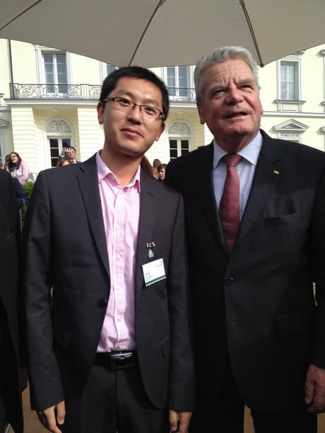 2014年6月,胡军在德国学习期间与时任德国总统约阿希姆·高克(Joachim Gauck)合影