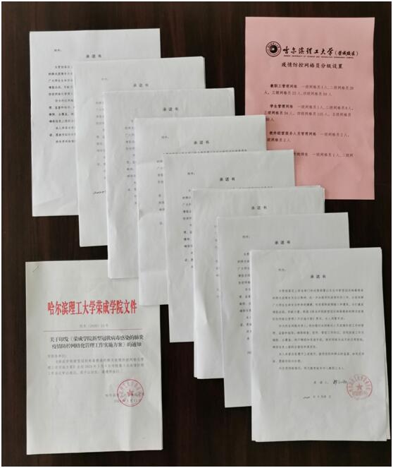 疫情期间,荣成学院在应对急难战“疫”中积极探索提升管理效能的实招,实行“疫情防控工作网格化管理”,把全院师生纳入自上而下分工负责的管理体系,打破部门工作壁垒,倡导多部门协同,划分为教职工、学生、校外经营服务人员以及外教和暂居海外师生等四类人群“人员管理网格”,和线上教学及质量督导、校园安全保卫及常住人员管理、消杀防护及物资储备、信息统计及宣传培训、网络安全维护等若干“职能工作网格”。教职工实行“人事办公室-部门-科室-工作组”管理;学生实行“学生工作办-系-辅导员-班主任-班级”管理;校外经营服务人员实行“后勤+资产运营管理中心”双主体管理;外教、暂居海外师生实行“本系部+外事”双重管理;每栋校内楼宇、每个商业单元均设一级网格,明确学院中层干部任一级网格长。由纪检监察室牵头,分级分层签订疫情防控责任书525份,压实主体责任,明确问责边界,实现盯防联防群防无死角、全覆盖。由学院办公室汇总,对已确诊、在湖北、有湖北逗留经停、与湖北籍人有接触、外地逗留或教学实习志愿服务、在国外境外、集中隔离和居家隔离、已返回荣成人员情况“日报告”学院疫情防控工作群,并梳理上级主管部门和驻地防疫工作会议文件精神“周传达”至学院疫情防控视频例会;对属地负责、网格管理中出现的疫情防控工作具体问题和推进情况,逐级报告、快速反映。学院注重从官方发布信息、网络平台留言、师生报告行动轨迹、部门报送信息报表中捕捉异常,与驻地疫情防控工作办公室、社区沟通了解情况,比对核实官方通报疑似病例与学院师生关联系数,主动发现并及时处置1例未如实报告的感染学生、1例不报告行踪且不配合居家隔离的临时工、1例拒不配合APP打卡的教师。