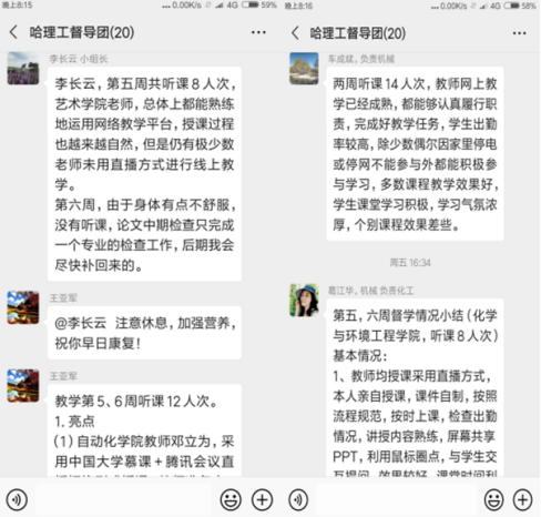 在听课(看课)以后,校级督学通过电话、微信、QQ及时与学院领导、教师进行沟通和交流,反馈在听课(看课)过程中发现的问题,并提出中肯的建议。通过在线教学督导工作群,各位督学每天及时反馈听课(看课)情况,每周五下午定时召开在线工作例会,从亮点、问题、改进建议三个方面进行一周工作总结,高教研究与教学质量评估中心及时梳理每位督学的意见建议,形成最后的校级督导每周工作小结,并及时发布在教学负责人工作群。院级督导通过微信、QQ、在线研讨会、经验交流会等渠道分别从师德师风、教学设计、教学组织、教学评价、教学效果、教学方式、授课平台、网络情况等维度对教师线上教学质量进行评价、反馈。目前,学校和二级学院已解决校院两级督导反馈的200多项问题,对于短时间内不能完全解决的问题,将会同相关职能部门尽快解决。