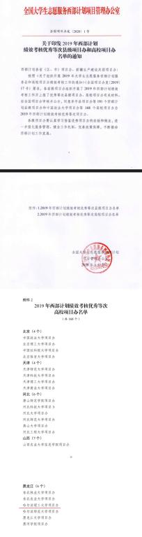 近日,团中央、全国大学生志愿服务西部计划项目管理办公室发布了《关于印发2019年西部计划绩效考核优秀等次县级项目办和高校项目办名单的通知》,我校被评为2019年西部计划绩效考核“全国高校优秀项目办”。