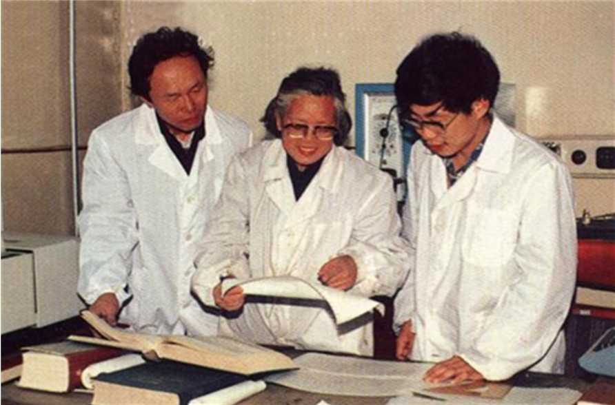 费敏明教授(中)与科研团队成员利用红外光谱分析材料结构