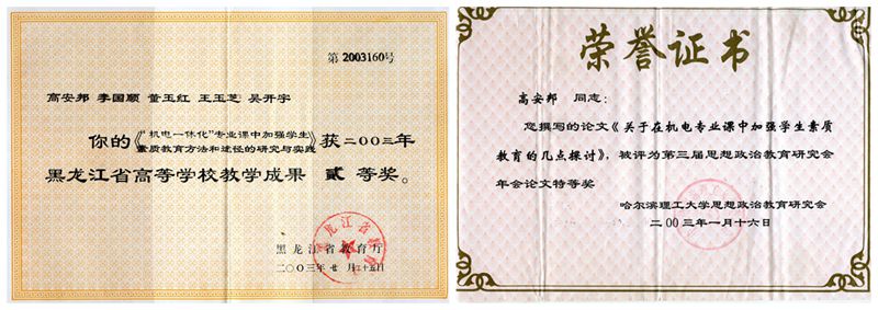 在教学成果方面,由天津大学张海根主编、我作为副主编的《机电传动控制》于2001年12月由高等教育出版社出版,被作为新世纪国家精品教材推出,成为高校机电专业统编教材,现已10多次印刷。由我主持创建的“机电传动控制(含PLC)”课程被评为哈理工校级精品课程,并被推荐申报省级精品课程发布在网上。由我主持完成的“在机电工程专业课中加强学生素质教育教学方法和途径的研究与实践”教学课题荣获2003年省级优秀教学成果二等奖,其研究报告在2003年哈理工第三届思想政治教育研讨会年会上荣获特等奖。特别感谢学校的是,2015年依靠这一奖项,我荣幸地被定为三级教授,退休金提高了1255.80元。