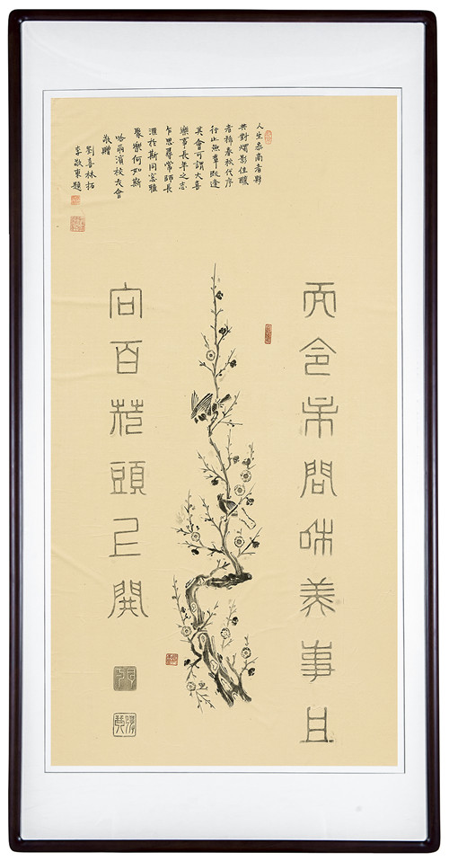 拓:“而今未问和美事 且向百花头上开”。印:哈尔滨理工大学建校七十周年纪念。跋:人生参商者伙,共对烛影佳酿者稀。春秋代序,行止无章。即逢其会,可谓大喜乐事。长年之志,乍思寻常。师长汇于斯,同窗雅聚,乐何如斯!哈尔滨校友会敬赠。刘喜林拓,孔继河篆刻,李敬东题跋。