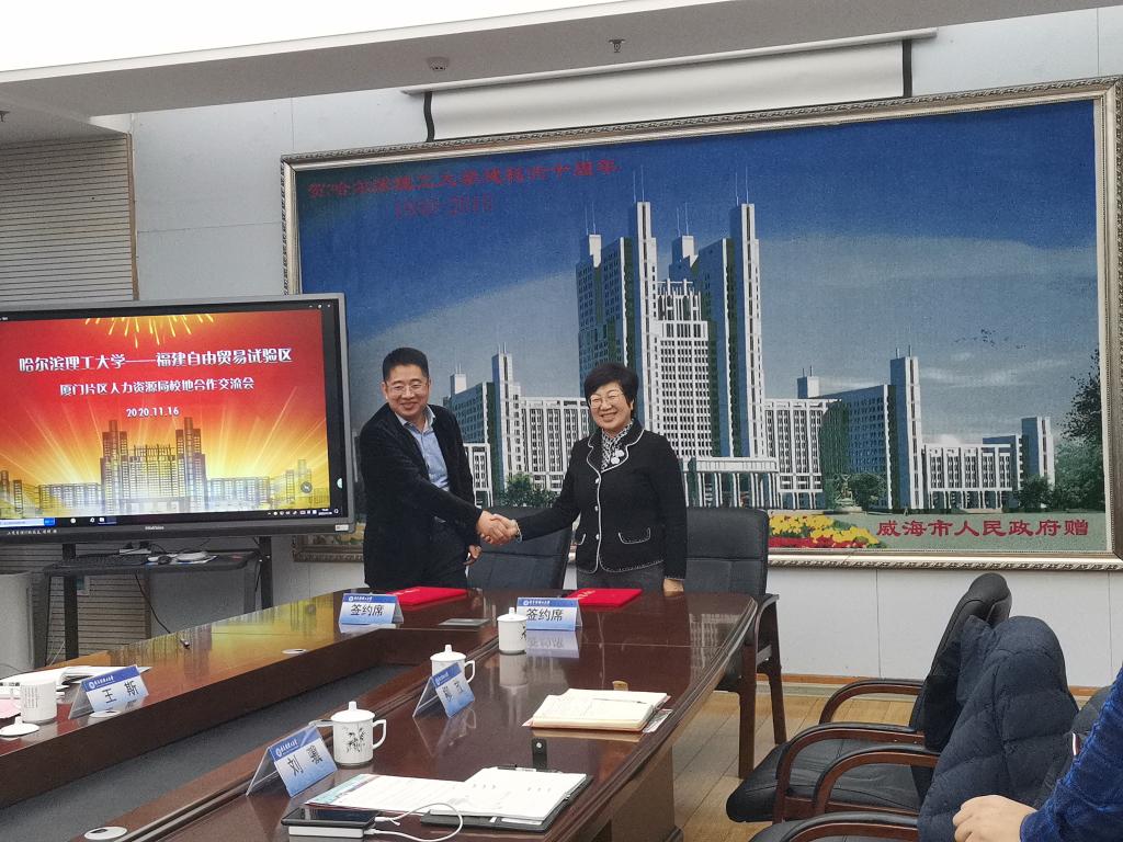 11月16日下午,中国(福建)自由贸易试验区厦门片区人力资源局代表团一行走进哈尔滨理工大学,与我校签署“共建毕业生就业服务平台合作协议”。厦门自贸片区管委会人力资源局局长陈燕彬、厦门市人才服务中心大学生就业服务部副部长陈云等相关工作人员出席签约仪式。我校党委副书记陆岩、科技处副处长相征、电气与电子工程学院副院长刘骥、软件与微电子学院副院长黄海、招生与就业工作处金乃斯、研究生处柳放出席签约仪式。签约仪式由党委副书记陆岩主持。
