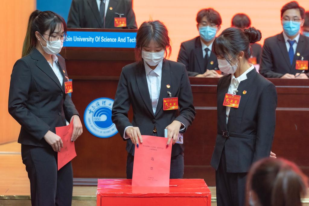 开幕式结束后,第一次学生代表大会和第一次研究生代表大会分别继续召开,王旭明同学代表哈尔滨理工大学学生会做了题为《不忘跟党初心,牢记青春使命;奋发务实进取,勇于自我革命;全面贯彻党的十九届五中全会精神》的工作报告,祖森同学代表哈尔滨理工大学研究生会做了题为《高举时代旗帜、践行青春使命;团结带领广大研究生开拓创新、锐意进取,为学校“双一流”建设贡献青春力量》的工作报告,随后,6个学生代表团和2个研究生代表团分别到会议室进行了分组讨论并对校领导讲话进行了学习,各代表团代表踊跃发言,各抒己见,热议学代会、研代会报告,预定工作进展顺利。分组讨论结束后,召开了大会主席团会议,并进行了大会选举。随后全体代表按照既定议程和大会选举办法,经过民主投票,选举产生了哈尔滨理工大学第一届学生会主席团成员和第一届研究生会主席团成员。