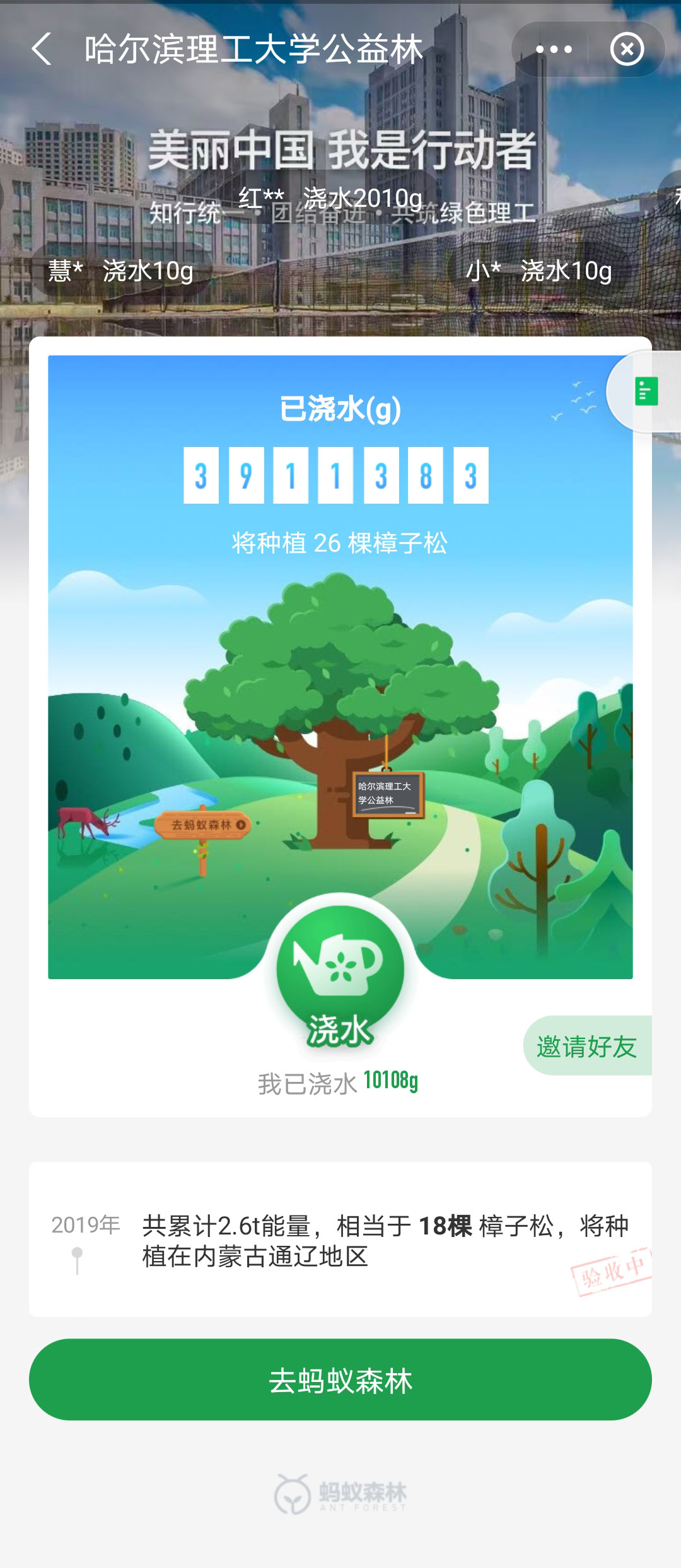 “云植树”让更多大学生因为公益汇聚到了一起,以集体的名义共植一片林。同学们每天为母校公益林浇水,公益林汇聚了许许多多关心母校、关心环保的人们的力量,仅仅2019年一年时间,我校青年学生就为内蒙古通辽地区种下了18棵樟子松,“云植树”促进了同学们养成早睡早起、合理作息的好习惯,为了能多给小树浇点水,同学们会每天多走几公里;早早地起床为了收集前一天低碳行为产生的蚂蚁能量……当同学们看到属于自己的樟子松将在内蒙古通辽地区种下时,内心充满了自豪感。