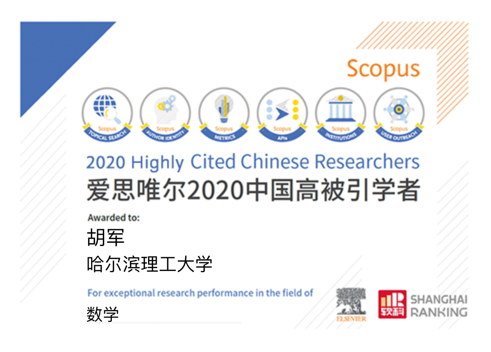 4月22日,爱思唯尔(Elsevier)正式发布2020年“中国高被引学者”榜单,该榜单以全球权威的引文与索引数据库--Scopus作为中国学者科研成果数据来源,采用软科设计的遴选方法,覆盖了教育部10个学科门类的84个一级学科,最终得到来自373个机构的4023名各学科最具全球影响力的中国学者。在数学领域,理学院胡军教授入选,实现了我校“中国高被引学者”零的突破。黑龙江省总计有4位学者入选2020年中国高被引学者榜单-“数学学科”,其余3位来自哈尔滨工业大学。胡军教授入选高被引学者榜单,展现了胡军及其团队在数学及相关交叉领域的重要贡献和广泛的影响力。