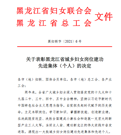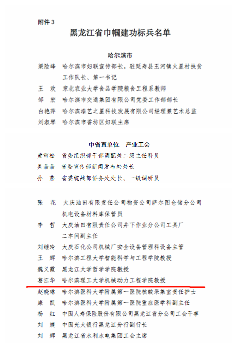 日前,黑龙江省妇女联合会、省总工会决定,表彰近两年来全省妇女职工深入贯彻落实党的十九大和十九届二中、三中、四中、五中全会精神,坚持以习近平新时代中国特色社会主义思想为指导,自觉担负起时代赋予的历史使命,立足本职岗位,学习新知识、掌握新技能、创造新业绩,在决战脱贫攻坚、决胜全面建成小康社会和造就一支宏大的新型产业工人大军,当好主人翁、建功新龙江的伟大实践中奋发进取,涌现出的妇女岗位建功先进集体和先进个人。我校机械动力工程学院葛江华教授被授予“黑龙江省巾帼建功标兵”荣誉称号。