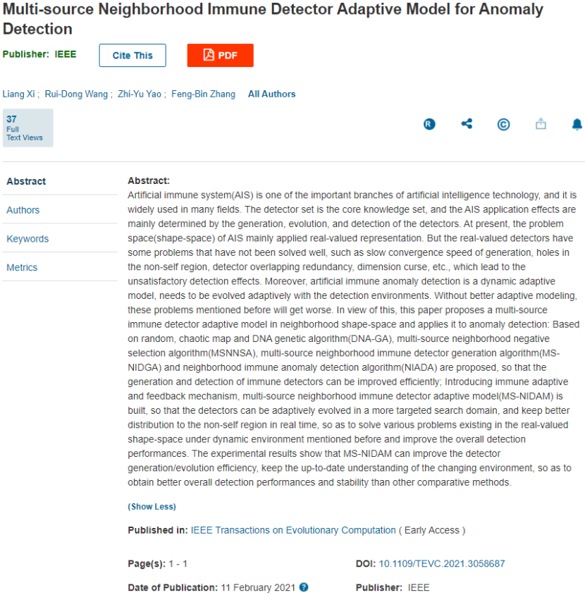 近日,我校计算机学院青年教师席亮副教授在IEEE Transactions on Evolutionary Computation上发表研究论文,题目为:Multi-source Neighborhood Immune Detector Adaptive Model for Anomaly Detection (第一作者,通讯作者,署名单位为哈尔滨理工大学,DOI: 10.1109/TEVC.2021.3058687, https://ieeexplore.ieee.org/document/9352964/)。IEEE Transactions on Evolutionary Computation(JCR一区Top期刊,中科院分区一区期刊,当前SCI影响因子为11.169,中国计算机学会推荐期刊人工智能方向B类期刊)主要刊登进化计算及其相关领域的高质量原创论文,包括自然启发算法、种群方法、选择和变异优化,以及基于以上方法结合的混合系统。这是我校教师首次在该期刊上发表科研成果。
